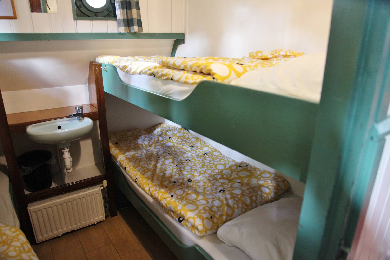 gemütlichen Tagesraum mit langen Tischen. Weiter vorne finden Sie die Kabinen nebst